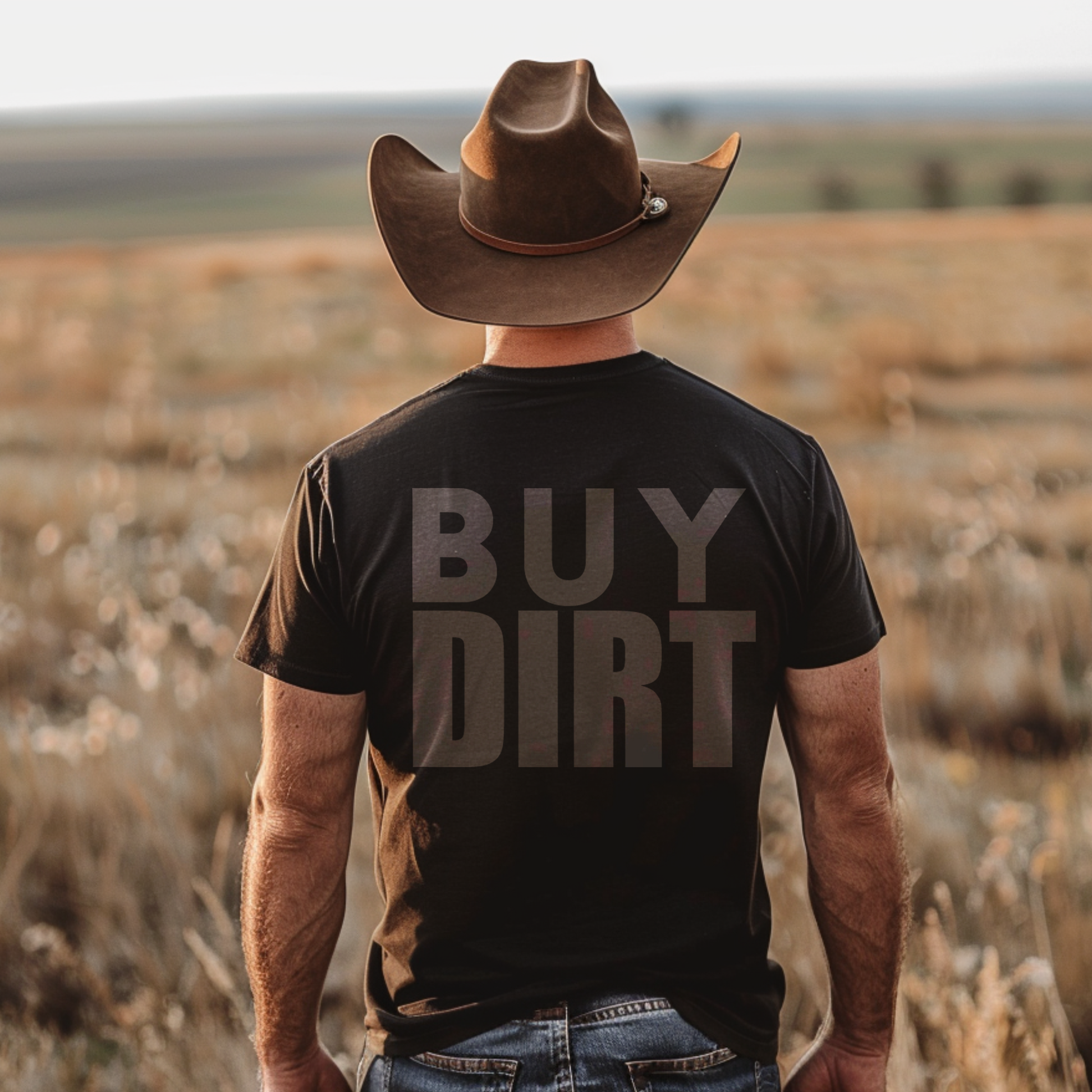 Back side only graphic "Buy Dirt" design in chocolate brown